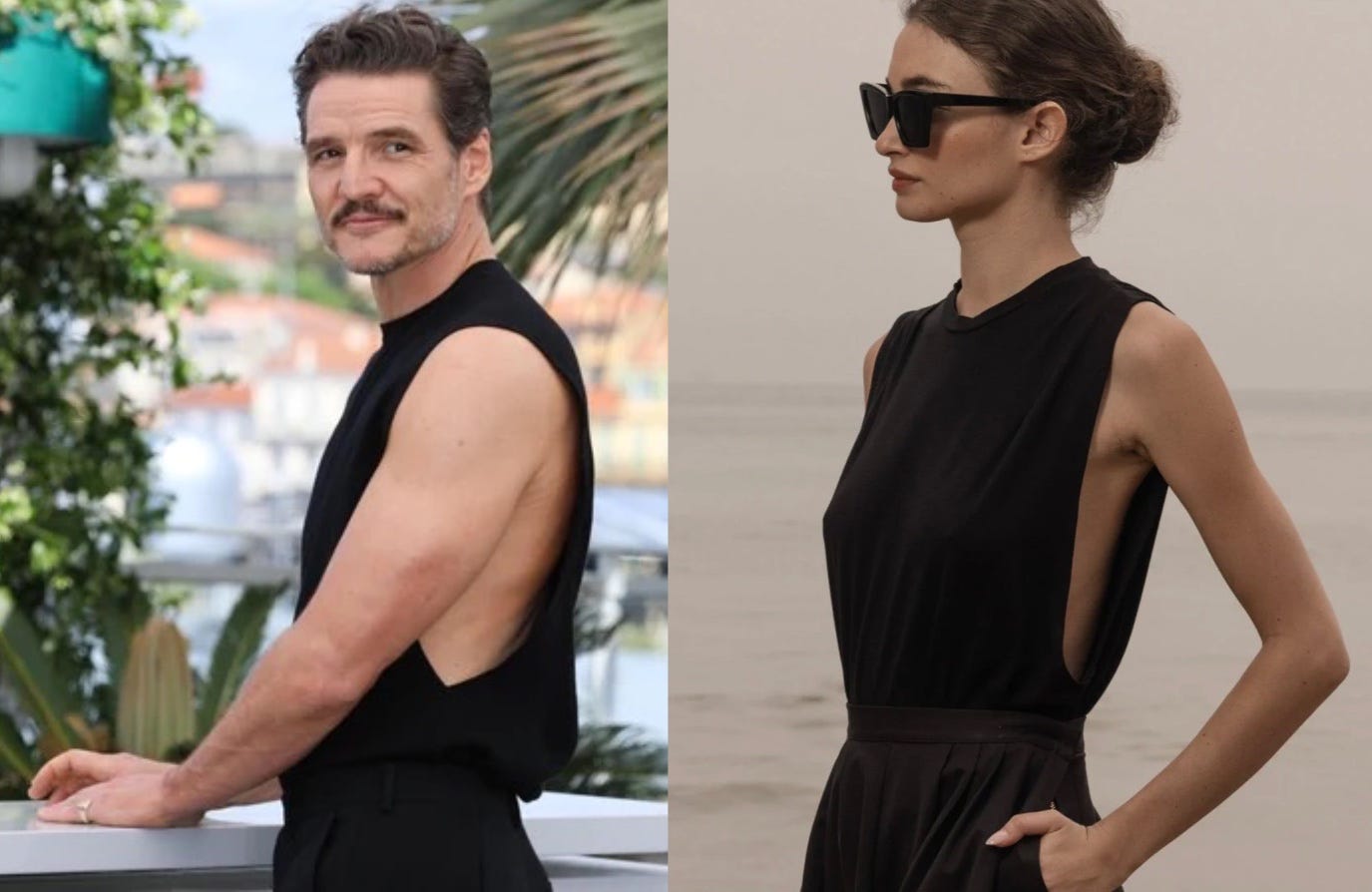 Non sequitur, but OMG — Pedro Pascal in this Calvin Klein muscle tank! I especially love the uber subtle mockneck detail that sets it apart from its athleisure cousins, e.g. Lululemon. The closest I’ve found so far is Heidi Merrick’s Expat tank, and this KOTN one is decent. Wear it over a bikini top or bandeau.